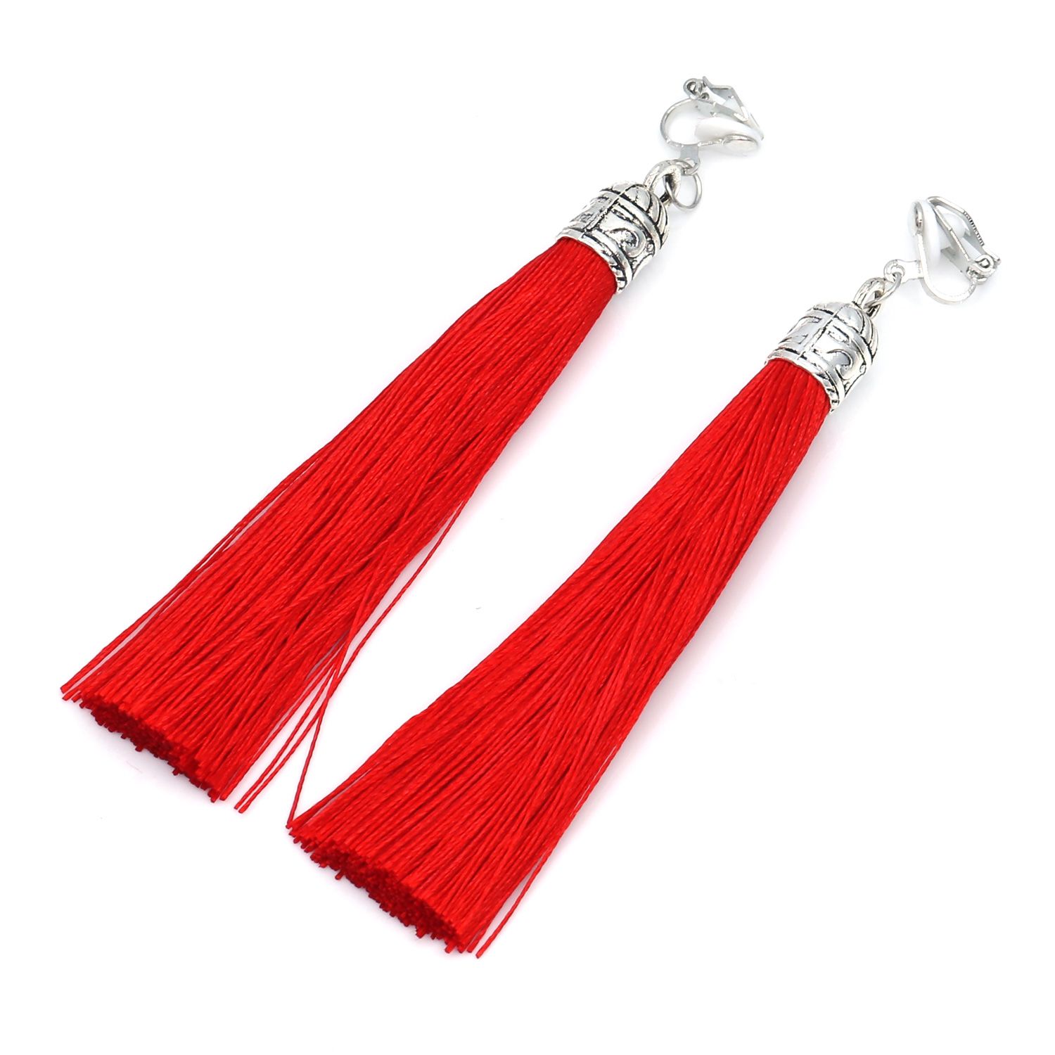 Red Tassel with Silver Tone Vintage Cap Statement Drop Clip On Earrings