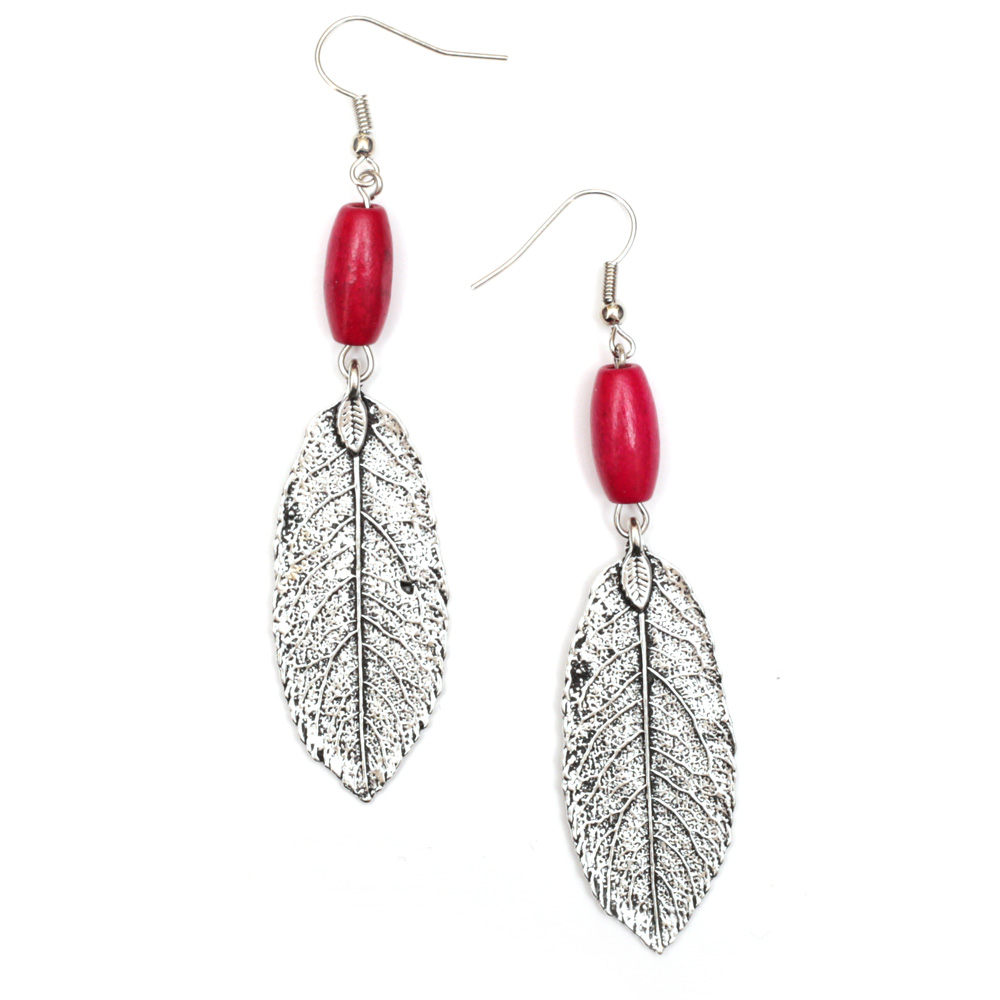 Diese Ohrhänger erhalten ihre Eleganz von den Blättern, die im Antiksilberlook modelliert sind. Begleitet werden die Blätter von dunkelroten Holzperlen, die Farbe zu den silberfarbenen Blättern beitragen.