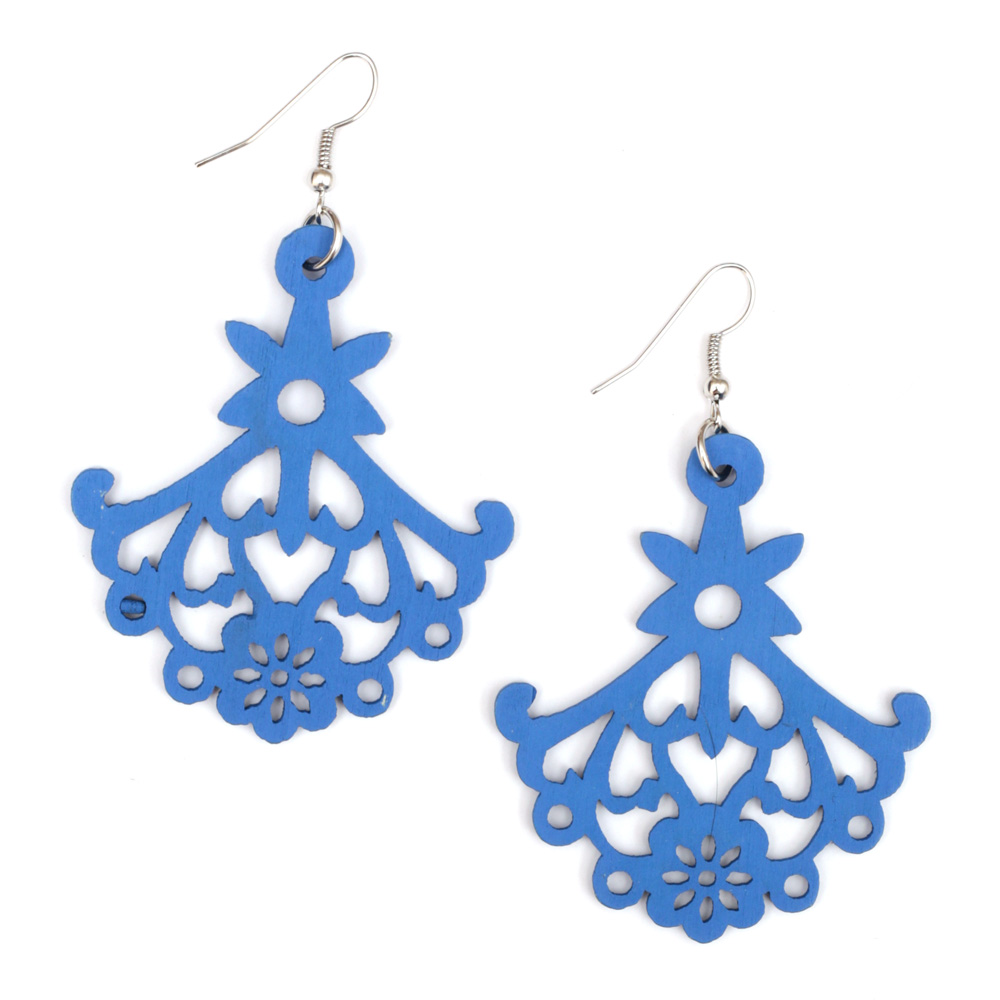 Blaue Holzohrhänger mit ausgespartem Blumenmotiv