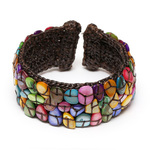 Dieser durchaus modische Manschettenarmreif verbindet gekonnt Eleganz mit modischem Aussehen. Der Armreif besteht aus gewachsten Fäden, auf denen kleine Steine in bunten, angenehmen Farben aufgenäht sind. Der Armreif ist leicht elastisch und passt sich somit bestens der gegebenen Handgelenksgröse an. Der Innendurchmesser beträt in etwa 6 cm.