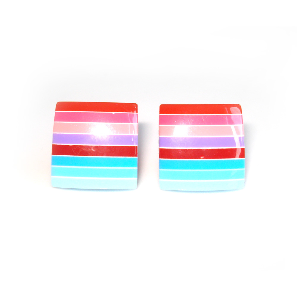 Diese Ohrstecker sind gänzlich aus Plastik und Kunstharz hergestellt und sind somit bestens geeignet für Personen mit Metallallergie. Die Ohrstecker sind quadratisch und messen ca. 15 x 15mm und weißen ein buntes Streifenmuster in blau-violetten Farbtönen auf.