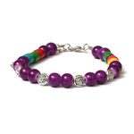Dieses Armband charmt einem dank der violetten Perlen, zwischen denen sich Perlen in Blumenform mit Antiksilber-Look befinden. Bunte, zylinderförmige Holzperlen tragen einen leichten Kontrast bei, der dieses Armband erst so richtig interessant macht. Das Armband wird mittels eines Karabinerverschlusses geschlossen und lässt sich somit auch in der Länge anpassen. Die Länge des Armbandes beträgt ca. 195 mm.
