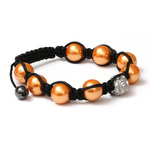 Dieses Armband im Shamballa Stil erhält seinen Charme von den orangefarbenen Perlen und der Perle mit Strass, was dem Armband ein schönes Funkeln verleiht. Es kann schnell mittels Anziehen an den Endschnüren verschlossen werden. Auf diesen Schnüren befinden sich auch kleinere Perlen aus Hämatit. Der Innendurchmesser beträgt ca. 55mm.